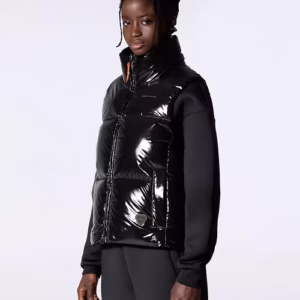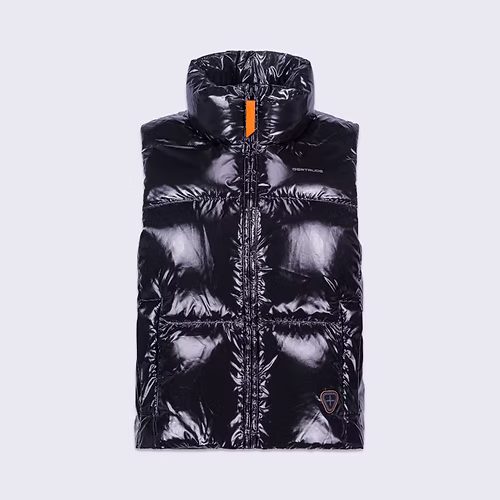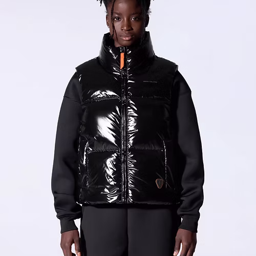 GALILEE est une doudoune sans manche à gros boudins, col montant, volume puffy confectionnée en matière brillante. Une capuche est cachée dans le col. L’ouverture milieu devant se fait par un zip en plastique injecté doté d’une tirette contrastée. Deux poches latérales sont insérées dans la découpe devant. Le logo de la marque est imprimé sur la poitrine. Le patch en silicone iconique ton sur ton est cousu sur le bas devant.
